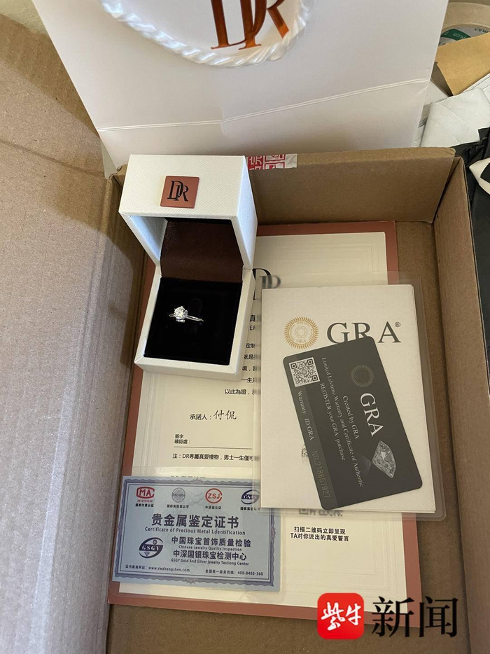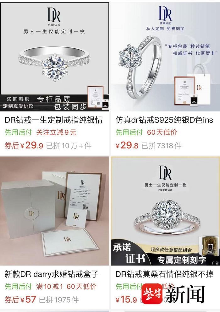 29.8元的DR钻戒你见过吗?七夕将至,电商平台上又涌现出一批“廉价求婚钻戒”,扬子晚报/紫牛新闻记者调查发现,几十块钱的“DR钻戒”还可以定制配套的“真爱协议”,还有“珠宝鉴定证书”以及“DR包装盒”。