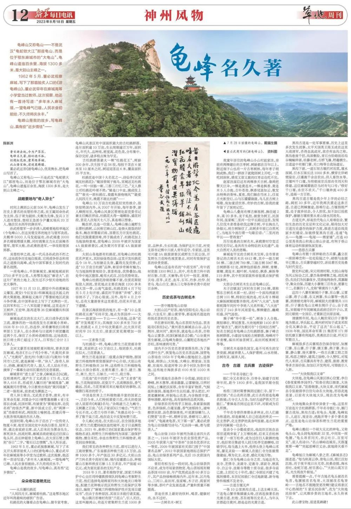 龟峰山又称龟山——不是武汉“龟蛇锁大江”那座龟山,而是位于鄂东麻城市的“大龟山”。龟峰山逶迤百余里,海拔1300多米,是大别山主峰之一。1962年5月,董必武视察麻城,写下了那首脍炙人口的《游龟峰山》。董必武早年在麻城高等小学堂当过教师。这次视察,他还有一首诗写道:“多年未入麻城境,一望龟峰气已雄。人民衣食初能给,不久终将庆永丰。”