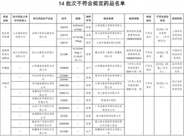 国家药监局近日发布通告,经上海市食品药品检验研究院等4家药品检验机构检验,发现11家企业生产的14批次药品不符合规定。