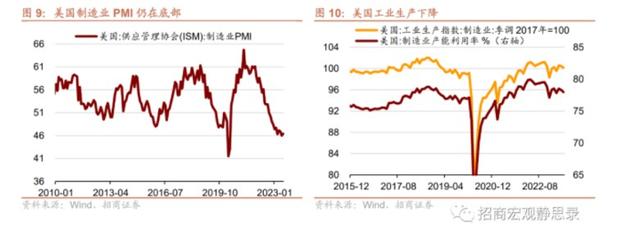 目前美国的工业生产相关指标仍较低迷,包括制造业PMI在历史低位,产能利用率边际转弱等。但鉴于前文提及的制造业投资近期迅速上升,两部重量级法案推动,同时制造业在今年以来呈现招工热现象,制造业时薪增速显著上升,与总体时薪增速走势反向,预计美国制造业即将企稳回升。
