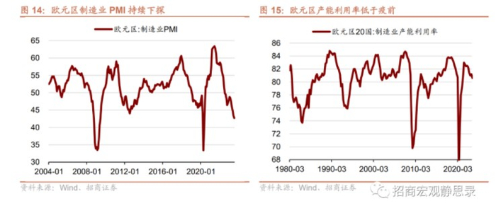 再看当前欧元区的工业生产指标,制造业PMI持续下探,7月录得42.7,若要回到荣枯线以上仍有很大距离,制造业产能利用率业从2022年一季度以来呈下降趋势,二季度为81.2%,较一季度小幅回升0.2%。从当前低迷工业表现来看,欧元区想要重振制造业本土化,任务艰巨。