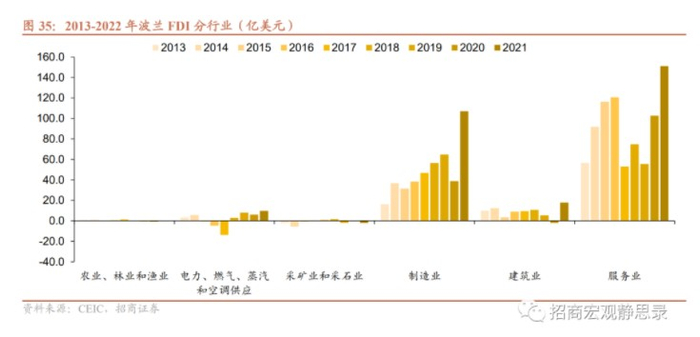 以波兰为例。从投资方式看,2016年起绿地投资金额快速、大幅增加,跨国并购金额偏低。从投资行业看,2021年FDI流入前三大行业分别是服务业、制造业和建筑业,占比分别为51.1%、36.2%、6.0%。制造业中,机械产品、金属制品、汽车占比排名前三;服务业中,专业科学和技术业、批发零售业、房地产占比排名前三。从投资来源看,波兰FDI流入以欧洲国家为主,根据波兰央行数据,2020年对波兰投资额排名前5位的国家分别是荷兰、卢森堡、德国、瑞士、塞浦路斯,占比分别为25.6%、16.7%、15.6%、7.0%、6.7%。
