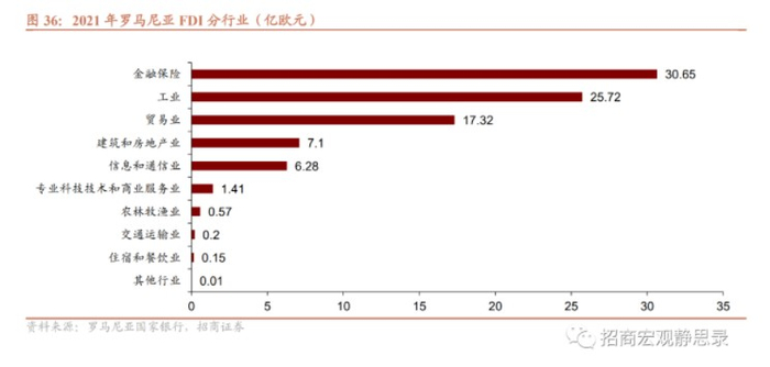 欧洲新兴国家:今明两年波兰和罗马尼亚FDI流入有望加快。疫后欧洲主要新兴国家FDI流入速度加快,尤其是波兰和罗马尼亚。2021年波兰前三大受益行业分别是服务业、制造业和建筑业;2021年罗马尼亚前5大受益行业分别为金融保险、工业、贸易业、建筑和房地产业、信息和通信业。疫后,波兰和罗马尼亚各获得581和292亿欧元的欧盟资金,有望对基建和制造业投资产生拉动。