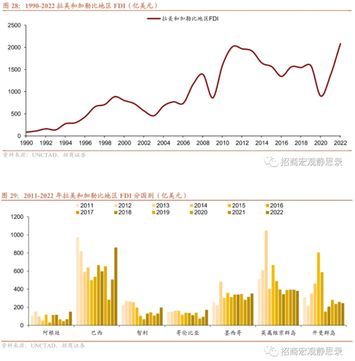 拉美地区多为资源国,支柱产业主要是上游能源和中游制造业。以墨西哥为例,从投资行业看,FDI流入前3大行业是制造业、金融保险业和采矿业,2020-2022年均占比分别为39.1%、20.1%、8.8%。其中,汽车行业是制造业最大部门和FDI流入最多的行业。从投资来源看,据墨西哥经济部统计,2021年FDI流入TOP5分别为美国、西班牙、加拿大、英国和德国,占比分别为47.5%、13.7%、6.5%、5.7%、5.2%。我们预计随着越来越多美国企业转向墨西哥“近岸外包”,美国的FDI占比有望继续扩大。