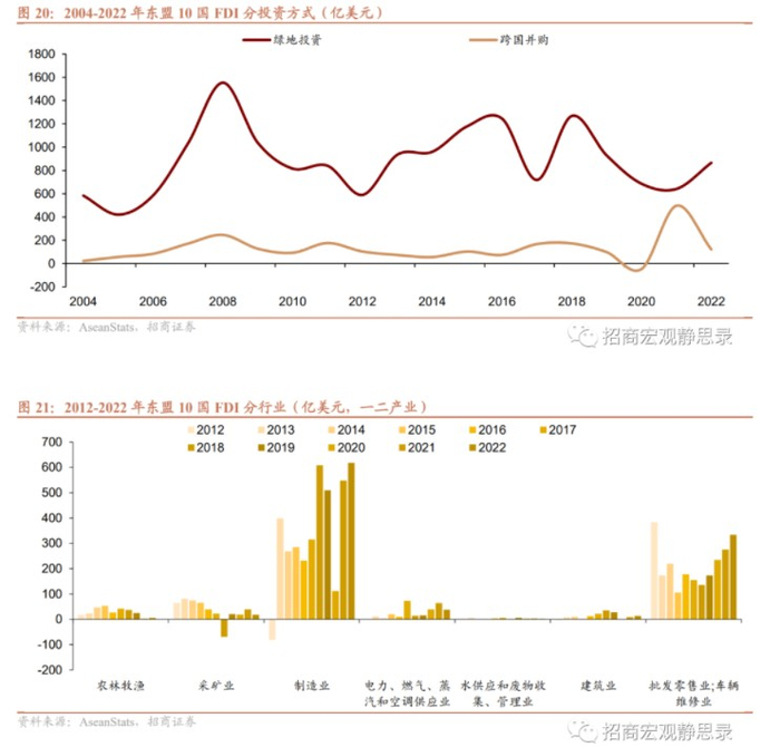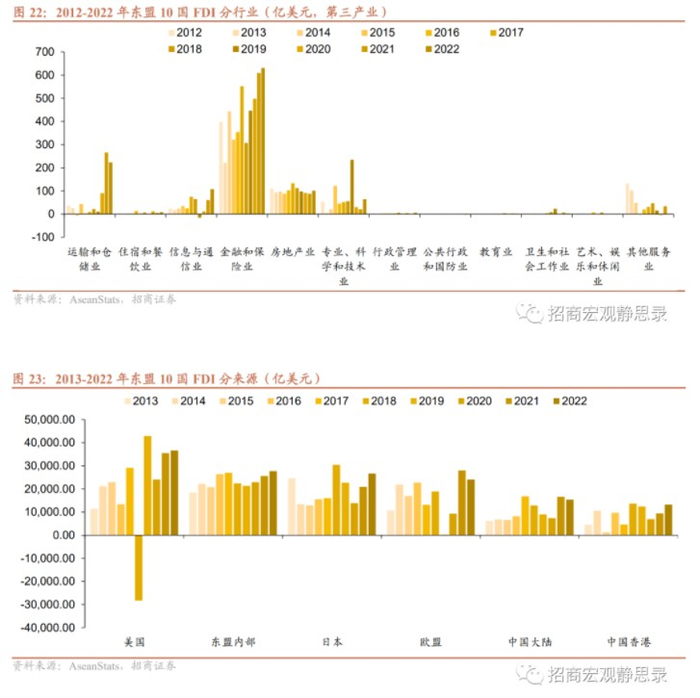 我们将东盟10国看成一个整体。从投资方式看,FDI投资主要以绿地投资为主,跨国并购占比较少,主要原因是绿地投资集中在制造业、建筑业等重资本行业,而跨国并购则以服务业为主。从投资行业看,FDI流入前3大行业是金融保险业、制造业和批发零售业,2022年FDI流入占比分别为28.1%、27.5%和14.9%,且疫情三年这3个行业规模持续上升。从投资来源看,2022年FDI流入TOP6分别为美国、东盟内部(Intra-Asean,新加坡主导)、日本、欧盟、中国内地、中国香港,占比分别为16.3%、12.3%、11.9%、10.7%、6.9%、5.9%。东盟地区投资来源相对分散,且疫后6个地区几乎同时增加对东盟的投资,侧面反映全球资金对东盟地区的青睐。