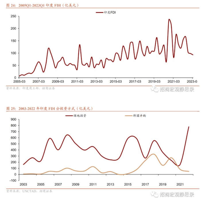 金融危机后印度FDI持续流入,但疫后FDI流入则明显放缓。从投资方式看,2017-2021年跨国并购金额增加,但2022年明显下滑,或与欧美亚投资者离场有关;2019-2021年绿地投资金额减少,但2022年大幅增加。从投资行业看,2022年FDI流入最大的行业是制造业、占比48.2%,其次是金融业、贸易业、建筑业,占比分别为13.1%、10.9%、5.5%。从投资来源看,2023Q1印度FDI流入TOP5分别为新加坡、毛里求斯、美国、日本、荷兰,占比分别为44.4%、15.1%、11.7%、4.0%、3.7%,2005Q1-2023Q1新加坡和毛里求斯合计占比均值为50%。