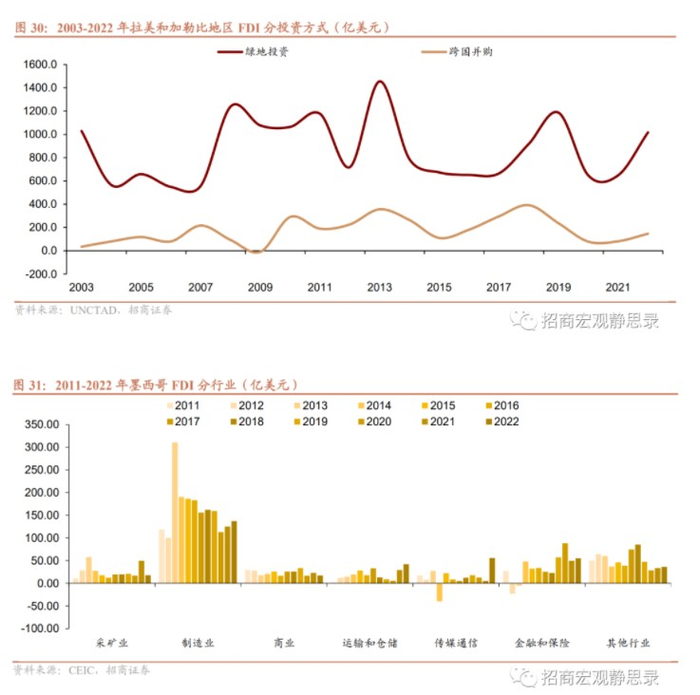金融危机后拉美和加勒比地区FDI流入变动较大,2011年大幅增加后持续下滑,2021-2022年持续增加,并在2022年创历史新高2084.5亿美元。其中,巴西FDI流入占拉美和加勒比地区比重最高,2022年为41.3%,其次是墨西哥、2022年占比16.9%,英属维京群岛和开曼群岛由于“避税属性”占比也较高,2022年占比分别为18.3%和11.8%。从投资方式看,FDI投资主要以绿地投资为主(包括上游能源和制造业),跨国并购占比较少。