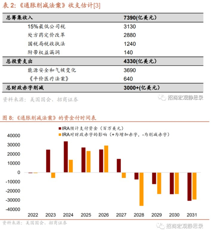《通胀削减法案》(IRA)计划在10年内获得7390亿美元收益,其中3690亿美元用于投资能源安全与气候变化,640亿美元用于改革医疗体系,从而削减财政赤字超过3000亿美元。