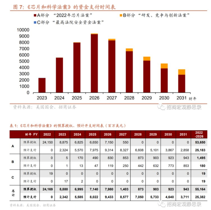根据美国国会公布的预算表,该法案将在2023-2027财年批准授权超过500亿美元的资金预算,这些资金绝大部分将在2023-2031年内完成支付,资金支付将在2025-2028年迎来高峰。