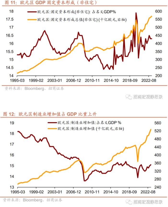 1)欧元区制造业增加值占GDP的比重从2022年以来有所提升,但制造业投资回升态势远不及美国。