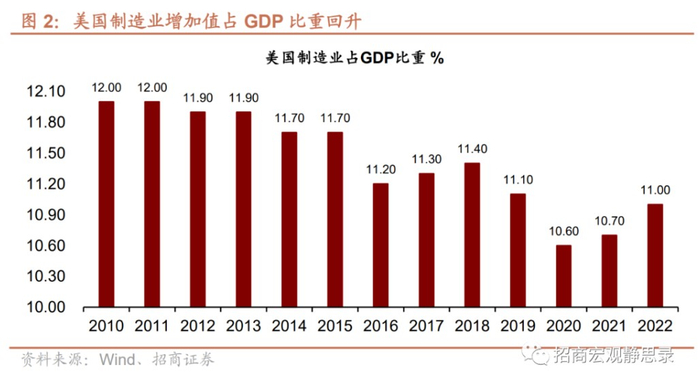 美国制造业增加值占GDP的比重从1950年代以来随着国家产业升级转型不断下降,近期呈回升趋势。新冠疫情爆发后,制造业增加值占GDP比重在2020年创下历史新低10.6%,2021和2022年连续回升至11.0%。