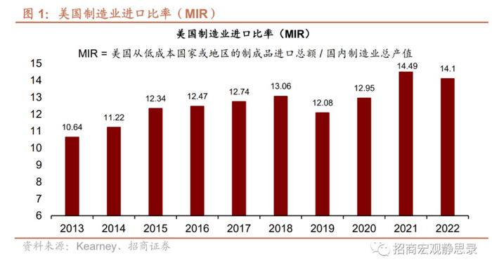 美国在2018年开始推进制造业回流的浪潮,包括当时发起中美贸易争端。2022年《芯片和科学法案》和《通胀削减法案》生效,进一步推进制造业本土化。根据科尔尼的《美国制造业回流指数》年报,2022 年,美国从低成本国家或地区进口的制成品总额占美国国内制造业总产值的比例从2021年的14.5% 下降0.3个百分点至14.1%,该比例在2019年也曾大幅下降1%。