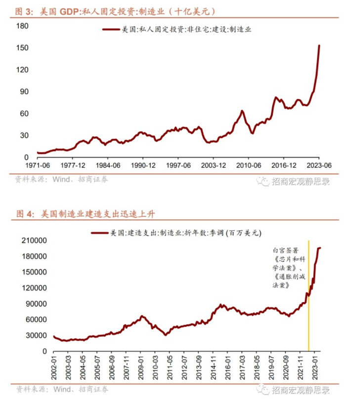 美国:2022Q3以来在两项法案支持下制造业投资迅速上升,未来四年财政均将助力制造业投资加速。