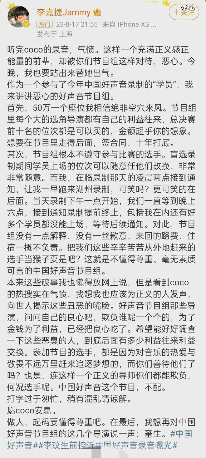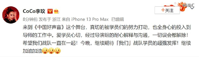 可是不到16个小时,他就删除了微博,并且对《好声音》节目组道歉。到目前为止,也还没有别的选手为李玟发声。