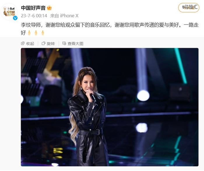 最让人感到愤怒和节目组无耻的是,在悼念微博中,官方微博用的还是这一场演出中李玟的照片。