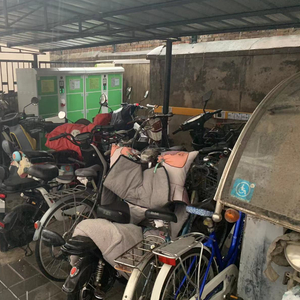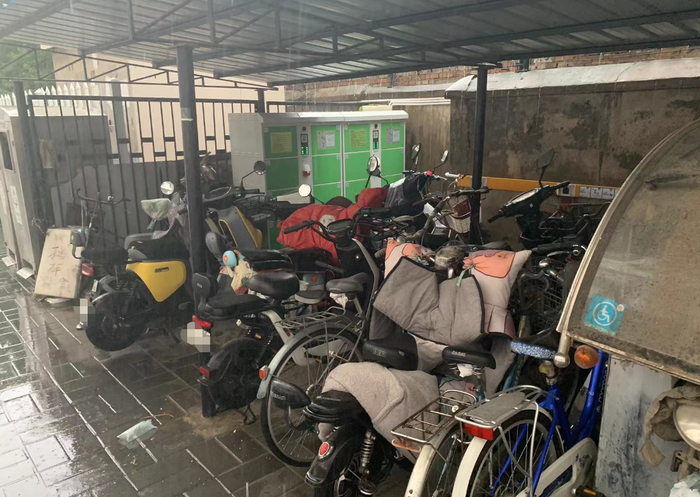 来到西城区一小区2号楼,楼下约20平方米的车棚内存放了六辆电动车、十几辆自行车和一辆老年代步车。这时,一位推着电动车的居民侧身挤进车棚内,停在充电插座前充上电后离开了。