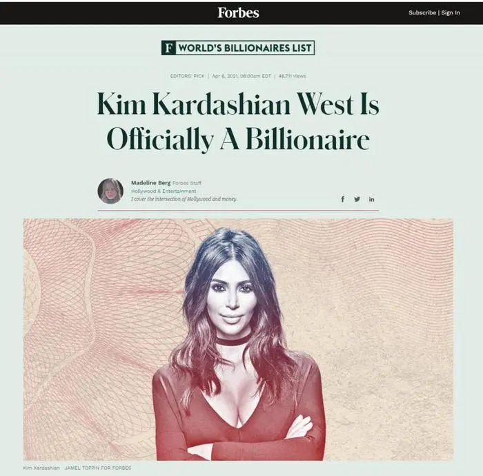 早在2021年,《福布斯》就披露金姐已经踏入十亿美元富翁俱乐部。这可不是和侃爷离婚分的财产,而是单纯的事业所得。从2011年到2021年,十年间她的身价翻了1000倍!