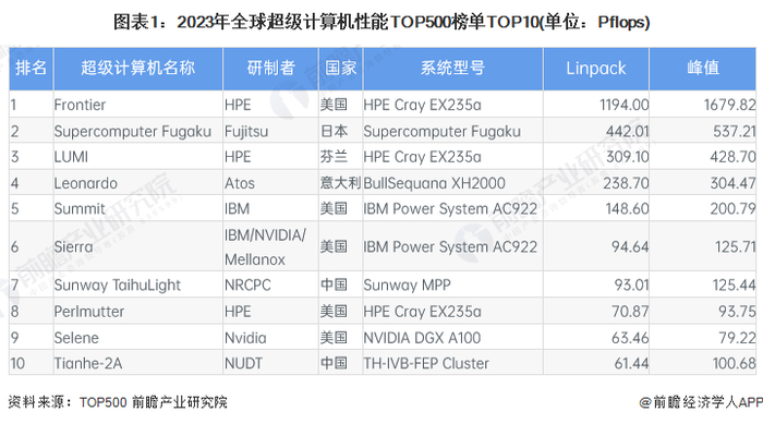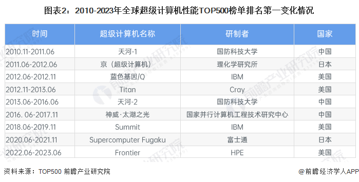 从历年TOP500名单来看,中国在顶尖超级计算机研发上的努力已经突显出来,自2010年凭借天河1号首次问鼎TOP500后,2013-2017年中国连续五年盘踞榜首。2018年6月,美国能源部宣布建成超级计算机Summit,登上TOP500榜首,并多次蝉联。在2020年6月公布的榜单中,Supercomputer Fugaku问鼎冠军,生产制造厂家为日本的富士通。2022年6月,美国的Frontier以1.102Eflop/s的成绩屠榜,成为第一个真正突破E级大关的超级计算机,在2023年6月公布的最新TOP500榜单中第三次蝉联冠军。