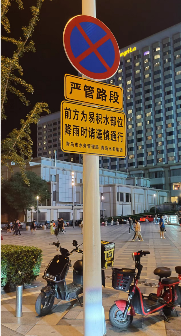 为提示广大市民雨天安全出行,青岛市水务管理局会同水务集团组织在青岛主城区地势低洼地段安装了50余个固定提示牌。降雨时派出专人值守,遇有积水现象采取设置警示标志、封闭道路、强制排水等措施,保障行人和车辆通行安全。