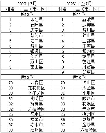 依据《城市环境空气质量排名技术规定》,按环境空气质量综合指数(简称综合指数)进行排序,2023年7月,9个中心城市环境空气质量由好到差依次为:都匀市、铜仁市、凯里市、兴义市、安顺市、六盘水市、贵阳市、毕节市、遵义市。88个县(市、区)城市环境空气质量相对较好的前10位(从第1名到第9名,含并列)为:印江县、石阡县、思南县、都匀市、江口县、务川县、镇远县、剑河县、万山区、雷山县;城市环境空气质量相对较差的后10位(从第79名到第88名,含并列)为:云岩区、红花岗区、七星关区、南明区、桐梓县、六枝特区、习水县、福泉市、赤水市、播州区。