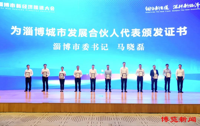 在新经济推进大会上,市委书记马晓磊为淄博城市发展合伙人代表颁发证书