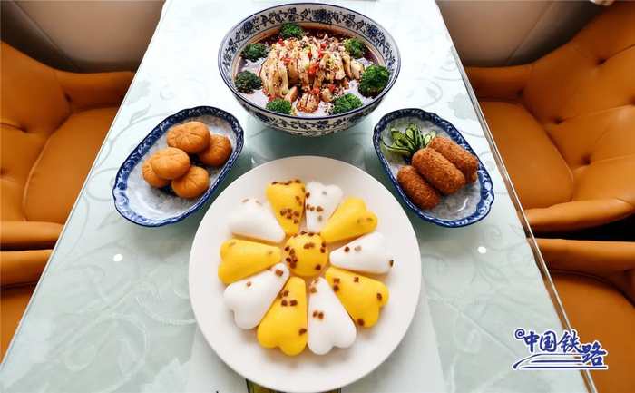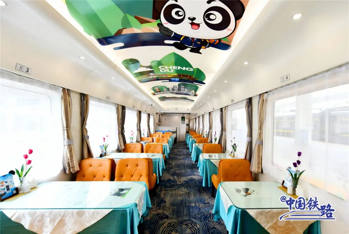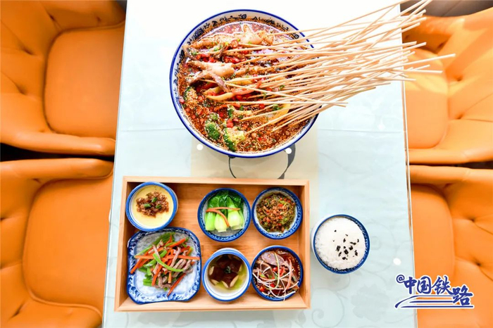 餐车提供冷锅串串、钵钵鸡、凉面、水饺、酸辣粉、熊猫套餐、七彩冰淇淋等川味特色餐饮。此外,厨师还可以烹饪羊肉串、手抓饭、大盘鸡等新疆特色美食,为旅客提供多种口味的餐饮选择。