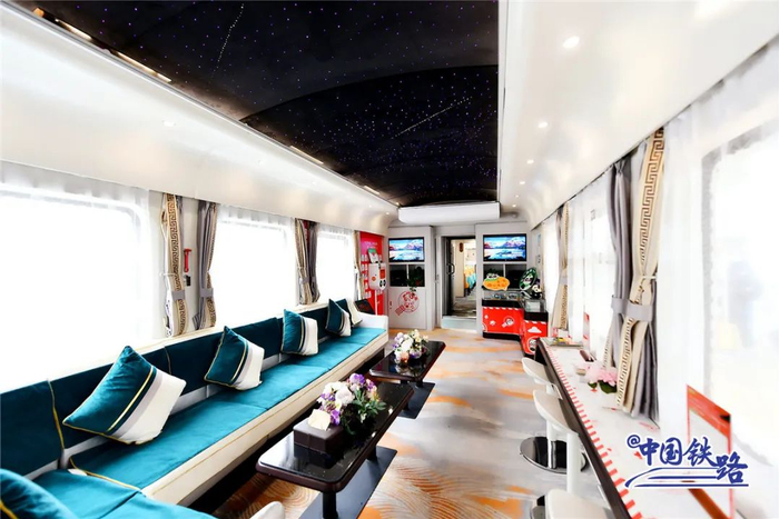 多功能车厢是集活动派对、棋牌娱乐、品茗休闲等为一体的多功能体验空间。车厢一侧的座椅面向车窗,绝对是最抢手的观景席,旅客可以边喝茶边欣赏窗外美景。