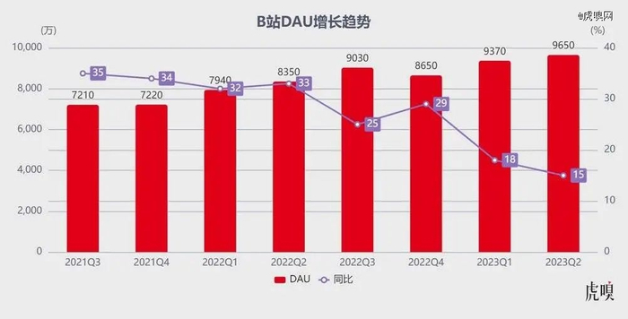 纵向看用户增长:在市场费用同比下降 22% 的前提下,B 站 2023Q2 季度 DAU(日均活跃用户)同比增长 15% 达 9650 万,说明平台出圈过程中在持续吸收新用户,管理层预期 DAU 在三季度可以迈进 1 亿大关;MAU(月均活跃用户)同比增长 6% 达 3.24 亿。