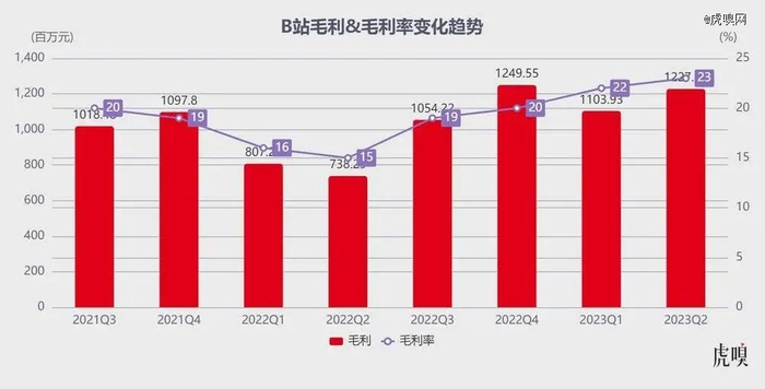 值得一提的是,B 站 2023Q2 毛利润约为 12 亿,同比增长 66%;毛利率则从 15% 提升至 23%,已连续四个季度持续提升。
