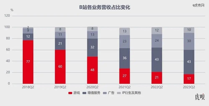 具体到业务贡献上:增值服务、广告、游戏、IP 衍生品及其他四块业务的整体营收占比分别为 43%、30%、17%、10%。