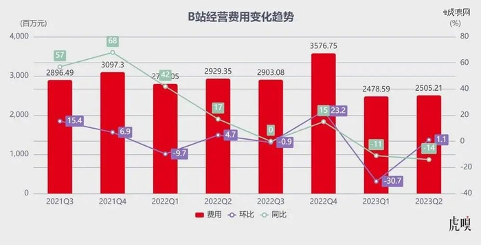 不妨将视线拉回 B 站 2023Q2 季度对费用的控制上:该季度经营开支总额为 25 亿元,同比减少 14%。其中,销售及营销费用同比减少 22%,管理费用同比下降 14%。