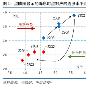 第一,点阵图提供的通胀与利率组合的演化走势来看,通胀降至3%以下即可推动降息落地。