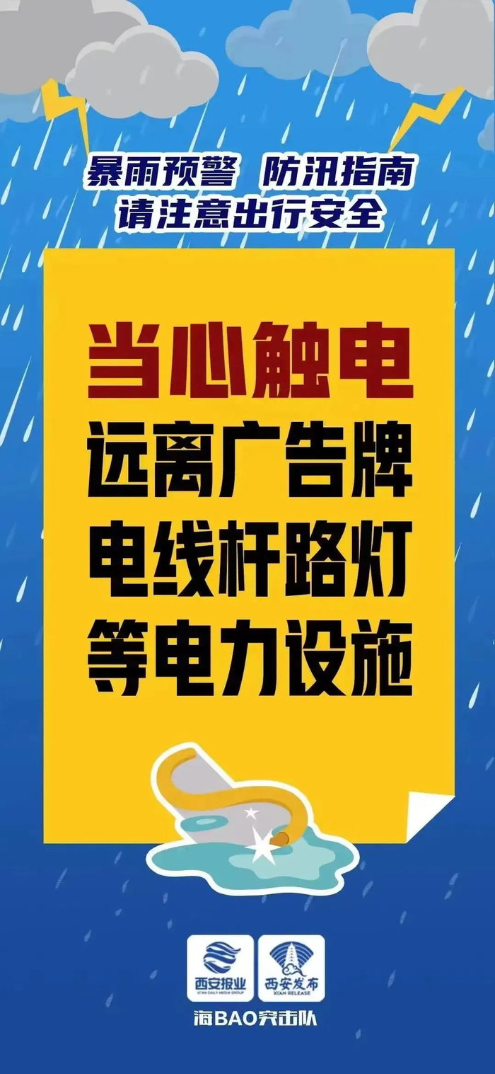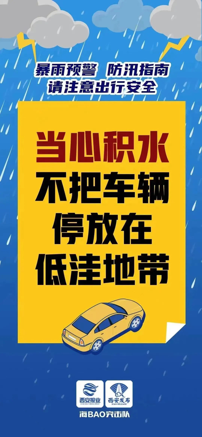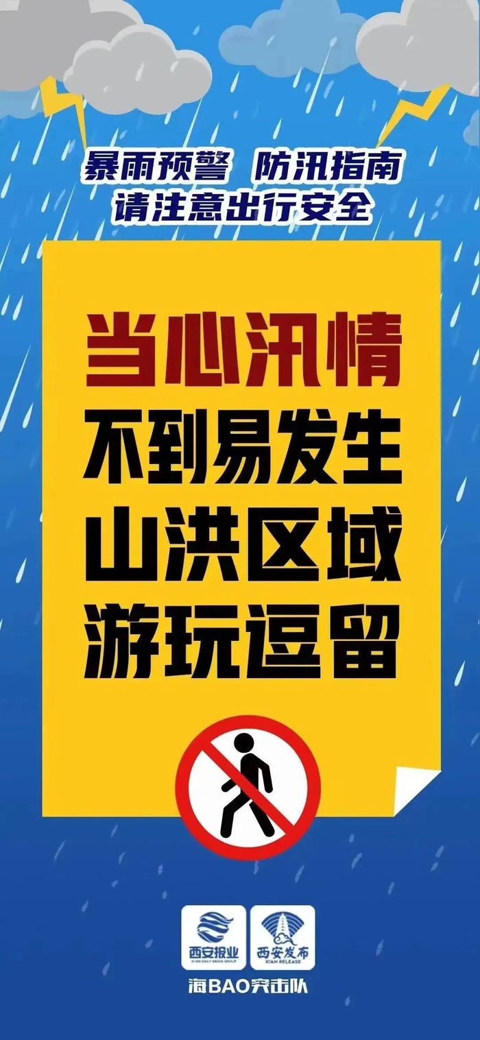 1.关注暴雨天气的影响。陕北北部、关中部分地方、陕南中东部有暴雨,易引发城市内涝、山洪、中小河流洪水及地质灾害等次生灾害,政府及相关部门按照职责做好相关防御工作。公众需密切关注预警,注意天气变化,雨天出行注意安全。根据当地政府安排果断及时撤离,远离临水临崖等灾害易发地带。