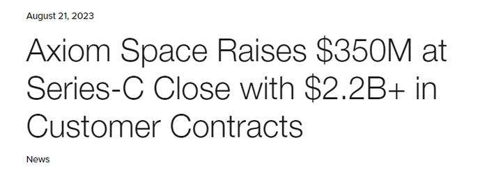 当地时间周一(8月21日),总部位于美国休斯顿的Axiom Space在官网宣布,公司在最新的C轮融资中筹集了3.5亿美元,使募集的总资金量达到了5.05亿美元