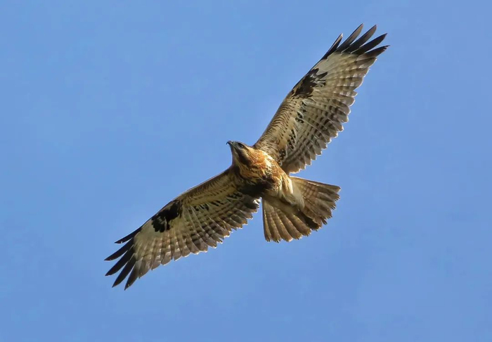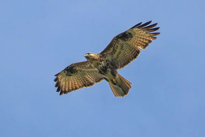 This amazing buzzard is characterized by its robust build, broad wingspan, and short, hooked beak. It typically grows up to 55 centimeters long, with an impressive wingspan of approximately 1.4 meters. The plumage of this species varies greatly, ranging from dark brown to pale brown with streaks or bars. Adult birds often exhibit a prominent white or light-colored throat patch, while juveniles have more mottled plumage and lack the throat patch.