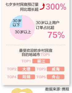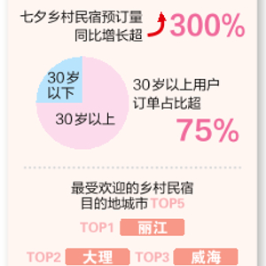 携程数据显示,七夕乡村住宿预订数据在迅速攀升,订单相比去年同期上涨3倍以上,云南、山东、广西最热门。在这些订单中,丽江、大理、威海、阳朔、舟山则是用户最钟爱的乡村目的地。