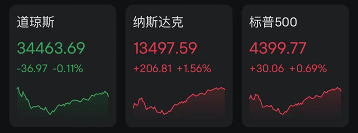 当地时间周一,美股集体高开,随后道指转跌,标普和纳指涨幅扩大。截至收盘,道指跌0.11%报34463.69点;标普500指数涨0.69%报4399.77点;纳指涨1.56%报13497.59点。