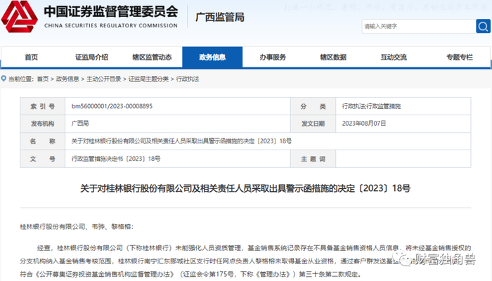 近日广西证监局向桂林银行出具了一份警示函,显示桂林银行未能强化人员资质管理,基金销售系统记录存在不具备基金销售资格人员信息,将未经基金销售授权的分支机构纳入基金销售考核范围,不符合相关规定,被广西证监局采取出具警示函的监管措施,并记入证券期货市场诚信档案。