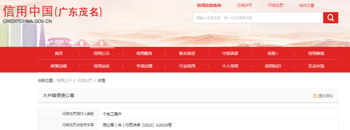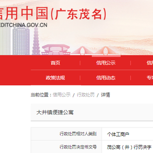 中国质量新闻网讯 近日,信用中国(广东茂名)网站发布一条处罚信息,涉及大井镇便捷公寓,该公寓不按规定登记住宿旅客信息。具体信息如下:
