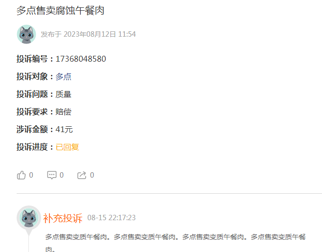 黑猫投诉平台有多起针对多点的投诉涉及食品