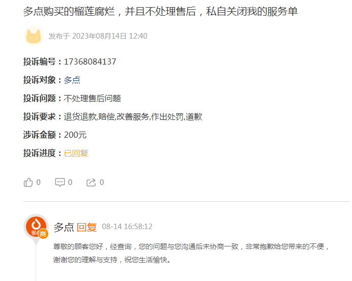 记者就此投诉向多点APP关联公司多点新鲜(北京)电子商务有限公司发送采访函询问,截至发稿,该公司没有任何回复。