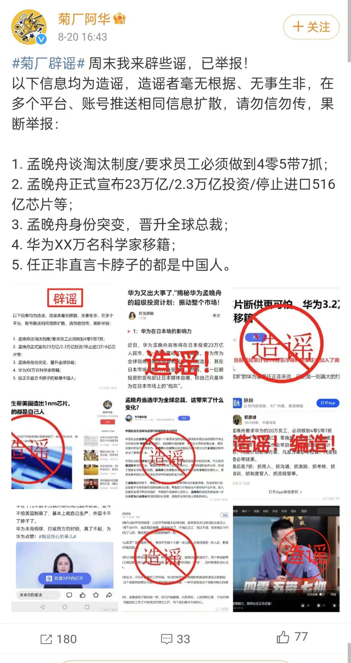 近日,针对华为公司的系列传闻,华为通过微博账号进行辟谣,并呼吁各位网友“勿信勿传,果断举报”。