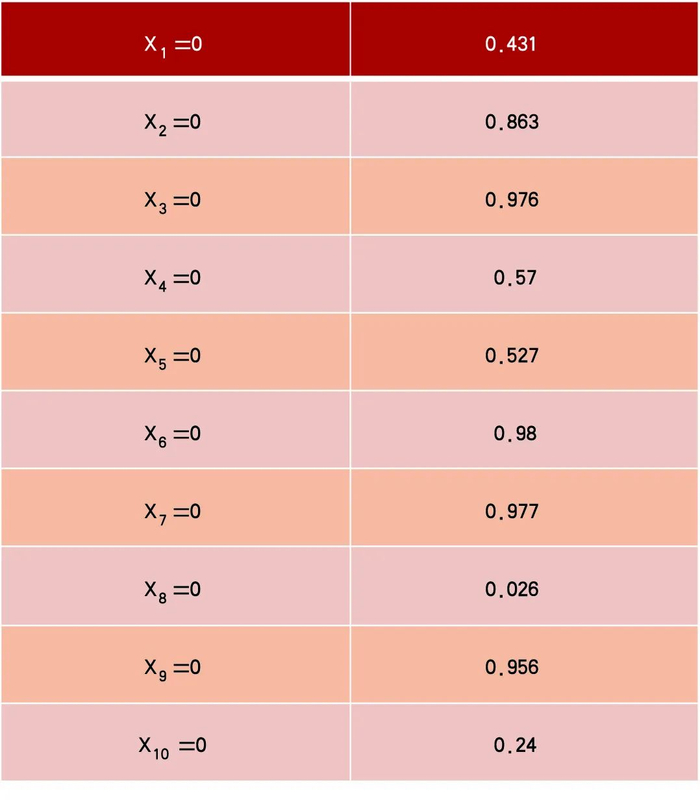 通过实际的金融数据的输入和角度的编码,我们可以得到在初始节点的概率一定的情况下,X1到X10系统可能出现的最大状态为:|1000000101>。这也就意味着,该系统最有可能出现的状态为变现比率高、短期投资比率高,其他指标低的情况,而如果我们进行每个比特观测统计测量,得到了10个量子比特对应的具体每个比特的概率测量结果,详见表1。