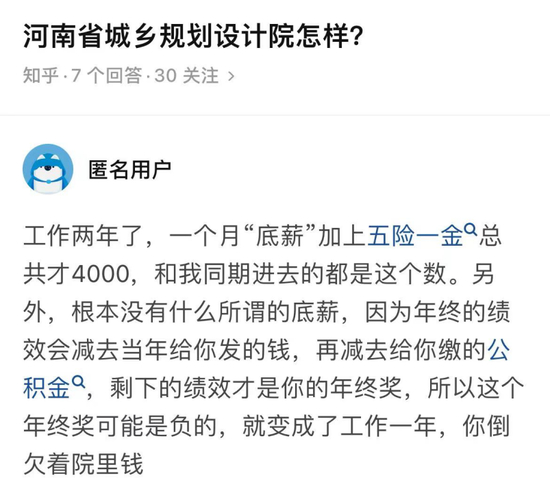 公开论坛上,一位自称公司员工的网友匿名发布了规划总院的薪资:工作两年,一个月底薪加五险一金才4000。也有网友表示,公司两千多人,部门繁多,不同部门之间的待遇差距很大,其真实性未验证。但据其在招聘软件上的公开信息,规划总院开出的薪资似乎并不具有竞争力。
