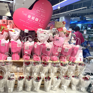 该连锁超市内在售鲜花均产自北京本地,9只红玫瑰带包装花束为88元。但特别搭配款,如上述特殊花束,每束价格则在200-300元区间。