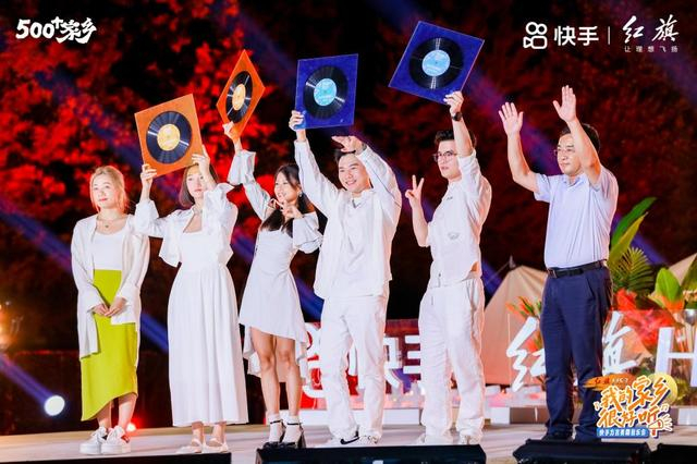 ▲阿健在写歌吗、郑向东、润夏-也叫嘟嘟、娜达韩最终赢得4个方言音乐麦霸席位,圆明园管理处主任邱文忠和快手潮流生活业务负责人黄咪咪为4位方言音乐麦霸颁发了奖杯。图片来源/快手官方