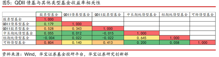按照华宝证券基金分类(见附录),计算2014年以来,境内各类型基金与QDII债基的月度收益率,QDII债基与股票型基金、中长期纯债基金、短期纯债型基金以及QDII股票型基金的相关性均较低。在投资组合中可与境内资产形成有效互补,起到丰富组合收益来源的作用。