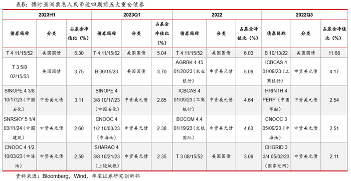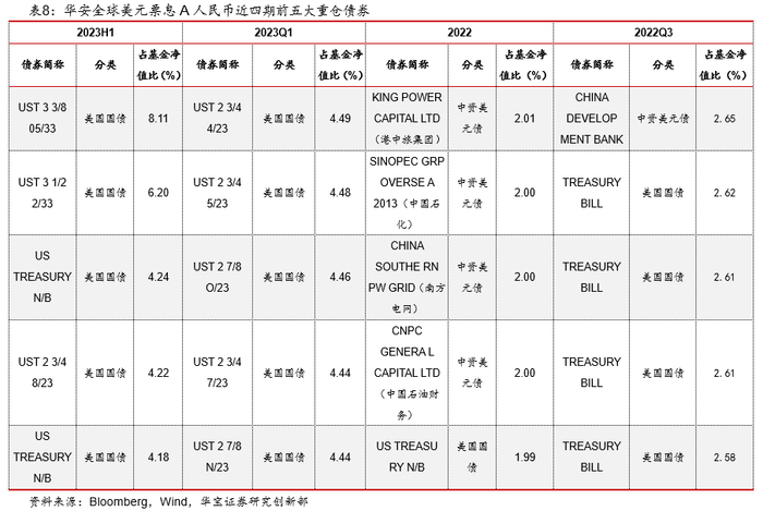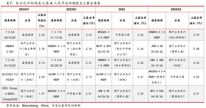 (3)久期限制:部分QDII债基会在基金合同中对持仓标的的久期进行限制:易方达中短期美元债A人民币的基金合同中规定“投资于中短期美元债券的资产不低于非现金基金资产的80%”;鹏华全球中短债人民币A规定“以中短期债券为主要投资标的”。此外,银华美元债精选近四期财报中前五大持仓债券的剩余到期期限均小于3年,此类基金我们定义为“有限制”。其他QDII债基在基金合同中并未对持仓债券的久期进行特殊约定,此类基金我们定义为“无限制”。美国长期国债以及境内金融、城投等机构发行的永续债也受到基金管理人的青睐。