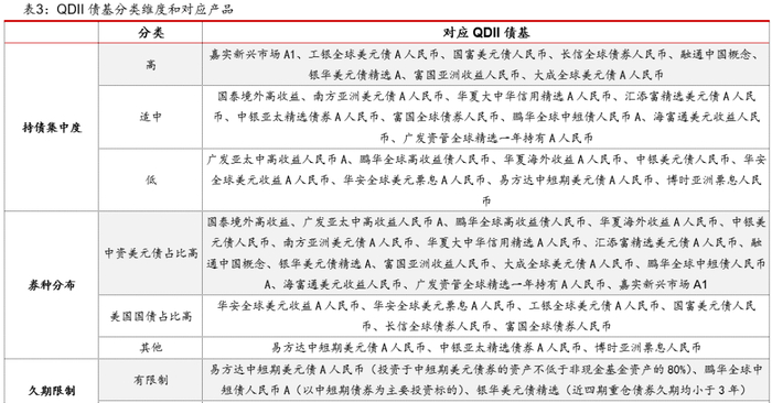 根据Wind分类,当前共有25只债券型QDII基金存续(仅保留主份额)。我们从券种分布、持债集中度、久期限制、信用等级限制、投资区域五个维度对QDII债基进一步分类: