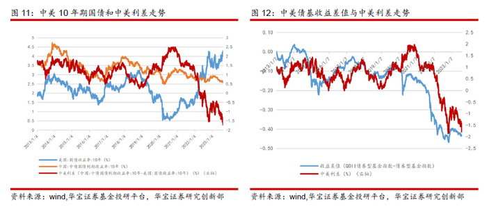 10年期国债收益率作为一个观测变量,回顾2013年以来的中美利差变动,大致经历了8个阶段。中美利差曾在2016.11-2018.01、2019.01-2020.11、2022.11-2023.04走阔,在2014.11-2016.10、2018.1-2018.12、2021.01-2022.10、2023.05至今收窄,在2013.1-2014.11保持震荡。另外,为了更直观的观察中美利差对评价QDII债基的性价比的作用,本文引入了债基收益差值指标(华宝QDII债券型基金指数-华宝中长期纯债型基金指数)。